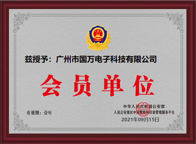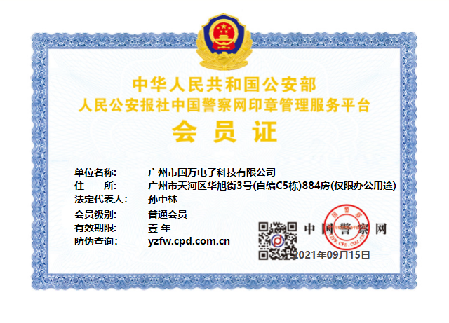 2021年9月15日,廣州市國萬電子科技有限公司(國萬科技KWOKMAN)因在2010-2021年經(jīng)營期間,信譽良好、無經(jīng)營異常、無重大負面輿情,符合中國警察網(wǎng)印章管理服務(wù)平臺推介規(guī)定,現(xiàn)已被納入印章管理服務(wù)平臺推介目錄,同時被授予了“會員單位”免審辦理資格。